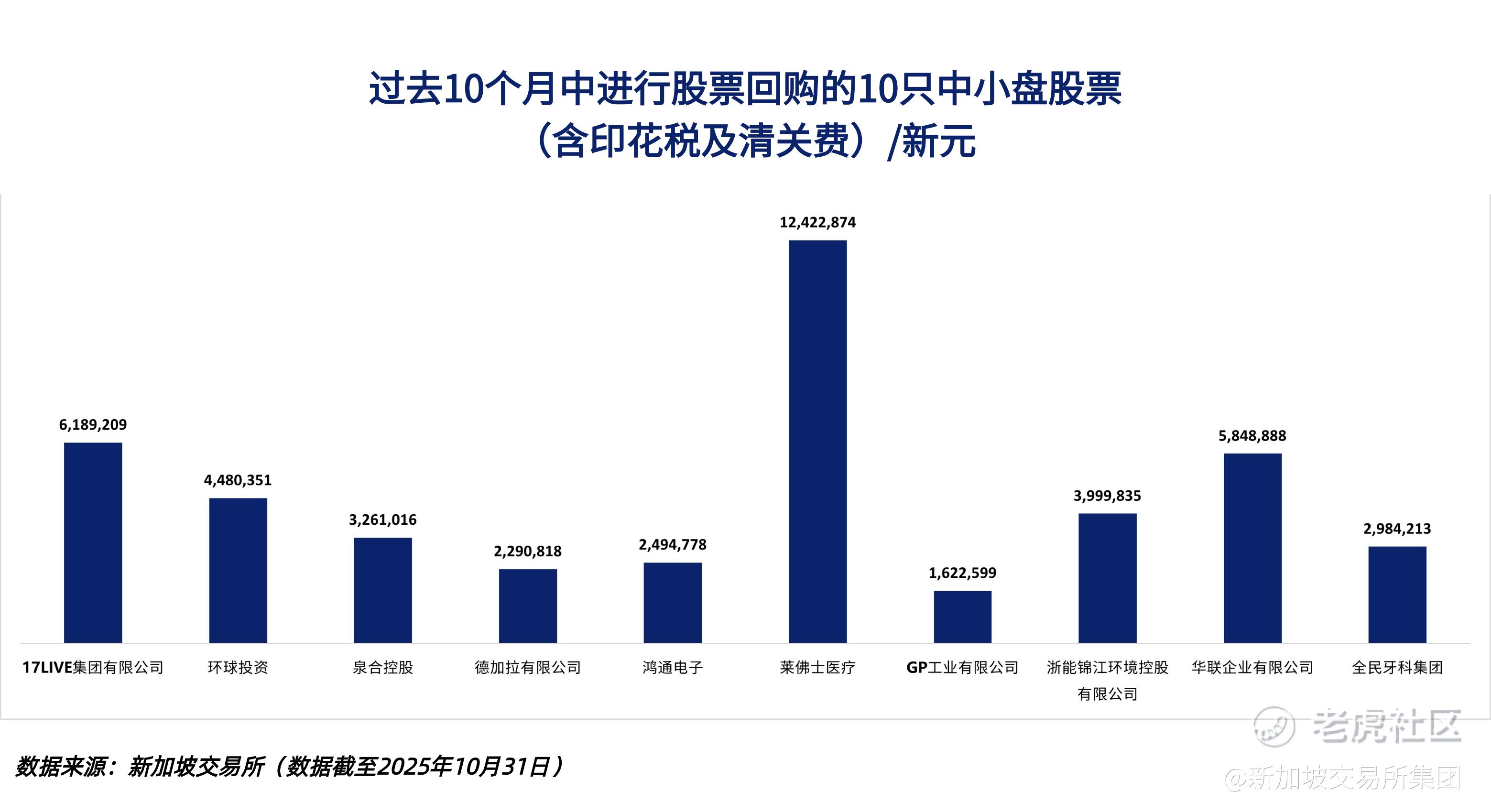 中小盘股中,由17Live集团(17LIVE GROUP)和环球投资(Global Investments)领衔。17Live集团今年以每股0.925新元的均价回购股份,累计回购对价620万新元,大约为其当前市值的3.4%。环球投资以每股0.126新元的均价回购股份,累计回购对价450万新元。