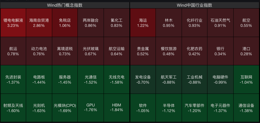 从板块看,锂电电解液板块领涨,海南自贸港、两岸融合概念板块再次反弹;电子元器件、CPO等算力硬件股下挫。