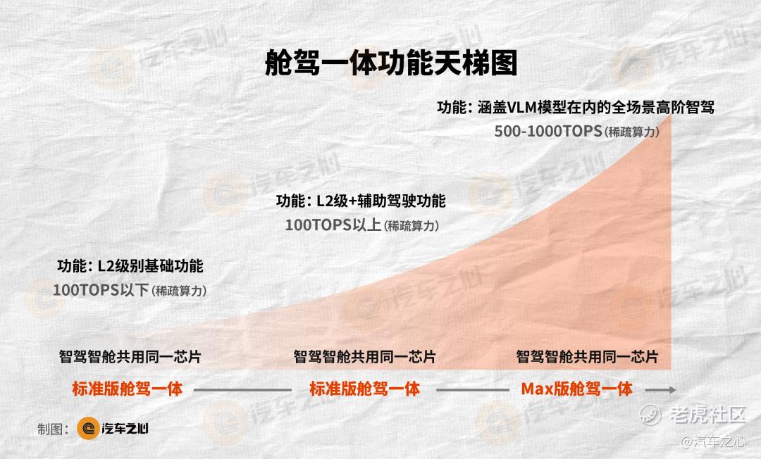 标准版舱驾一体:先满足「智驾智舱共用同一个芯片」,芯片总算力一般集中在 100TOPS 以下,以城区记忆领航、高速 NOA、记忆泊车等基础 L2 功能为主;