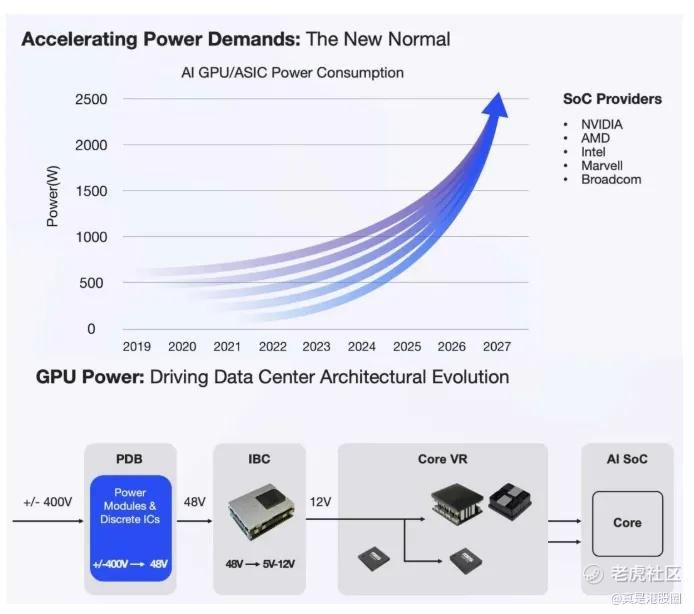 而电源管理芯片的迭代,实际上也可以运用在AI数据中心中,其核心思想就是控制用更大的电,通过功率提升来提升计算效率。所以在AI链的逻辑开始往发电、电力设备、储能、电控等发散的时候,这类模拟芯片公司实际上将很可能在板块中脱颖而出。