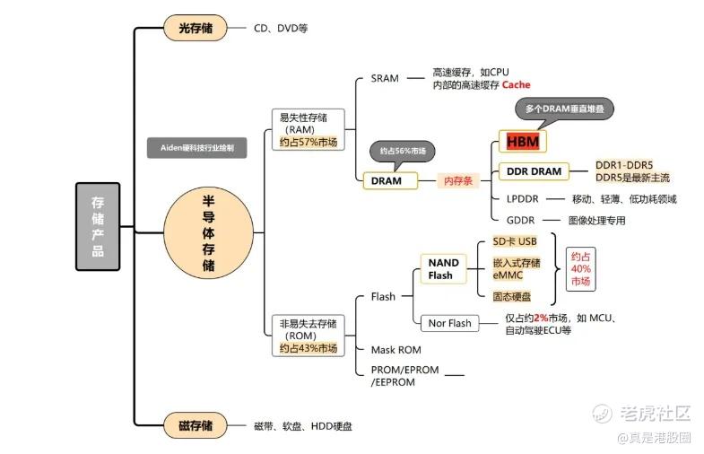HBM(高带宽内存),作为目前所有存储芯片中最高端的产品,在Ai算力中有重要作用,是大幅提升计算效率的关键,但很可惜,HBM的市场规模从0起步,直至今年才占到整个存储芯片的20%。换言之,前两年各类低门槛的存储芯片,仍然占据行业80%以上份额。10%的收入翻倍,只是整体增长10%。
