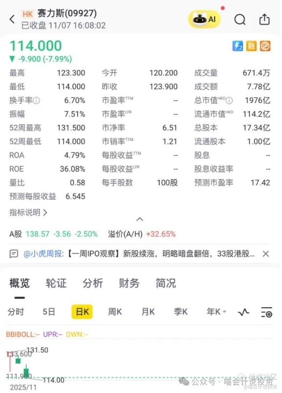 赛力斯(09927.HK)于2025年11月5日在港交所挂牌上市,发行价为131.5港元/股,上市首日股价便呈现大幅波动,盘中一度跌近10%,尾盘拉升后收平发行价。11月6日其股价跌破发行价,当日下跌4.94%。