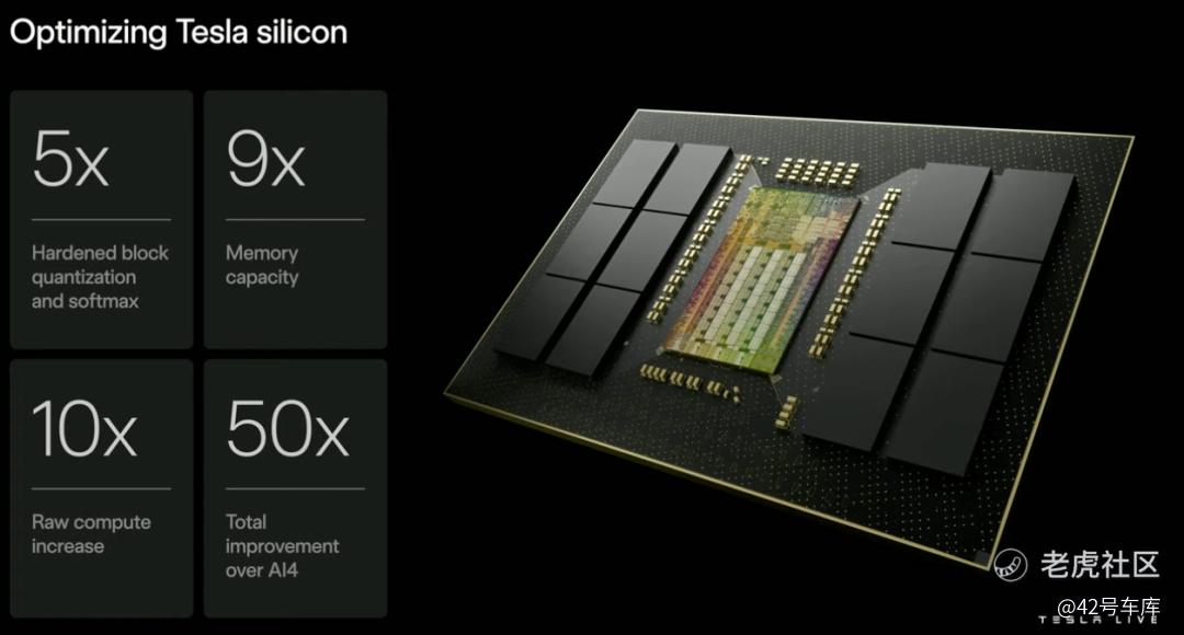 支撑这些现实世界 AI 的,是更底层的芯片系统。这次股东大会还披露了一些 AI5 芯片的细节:相较 AI4,AI5 将实现 9 倍内存容量、10 倍计算能效、50 倍总性能提升,能耗仅为英伟达 Blackwell 的 1/3,成本不到 1/10。