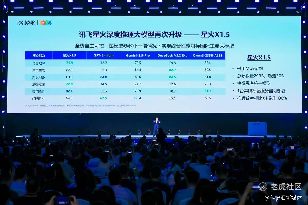 本次发布会的核心内容之一是讯飞星火X1.5深度推理大模型的正式发布,该模型已开放给开发者下载体验。其采用混合专家(MoE)架构,总参数量为2930亿,激活参数300亿,推理效率较上一代产品有所提升。
