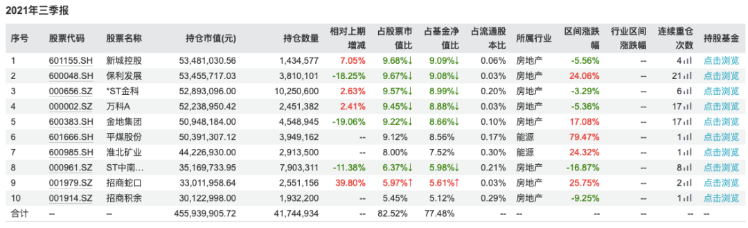 从2020年四季度到2021年四季度,地产行业的泡沫还未破裂时,该基金的持仓主要以地产股为主。