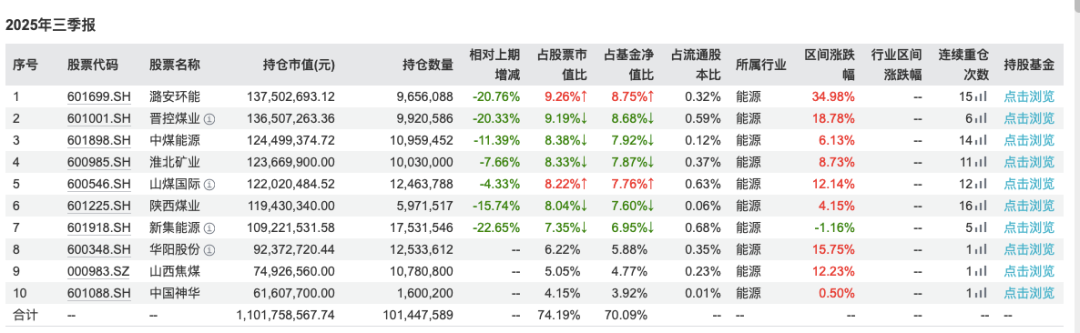 2025年三季报显示,万家精选A的重仓股清一色是能源股,包括潞安环能、晋控煤业、山煤国际、中煤能源、淮北矿业、陕西煤业等。