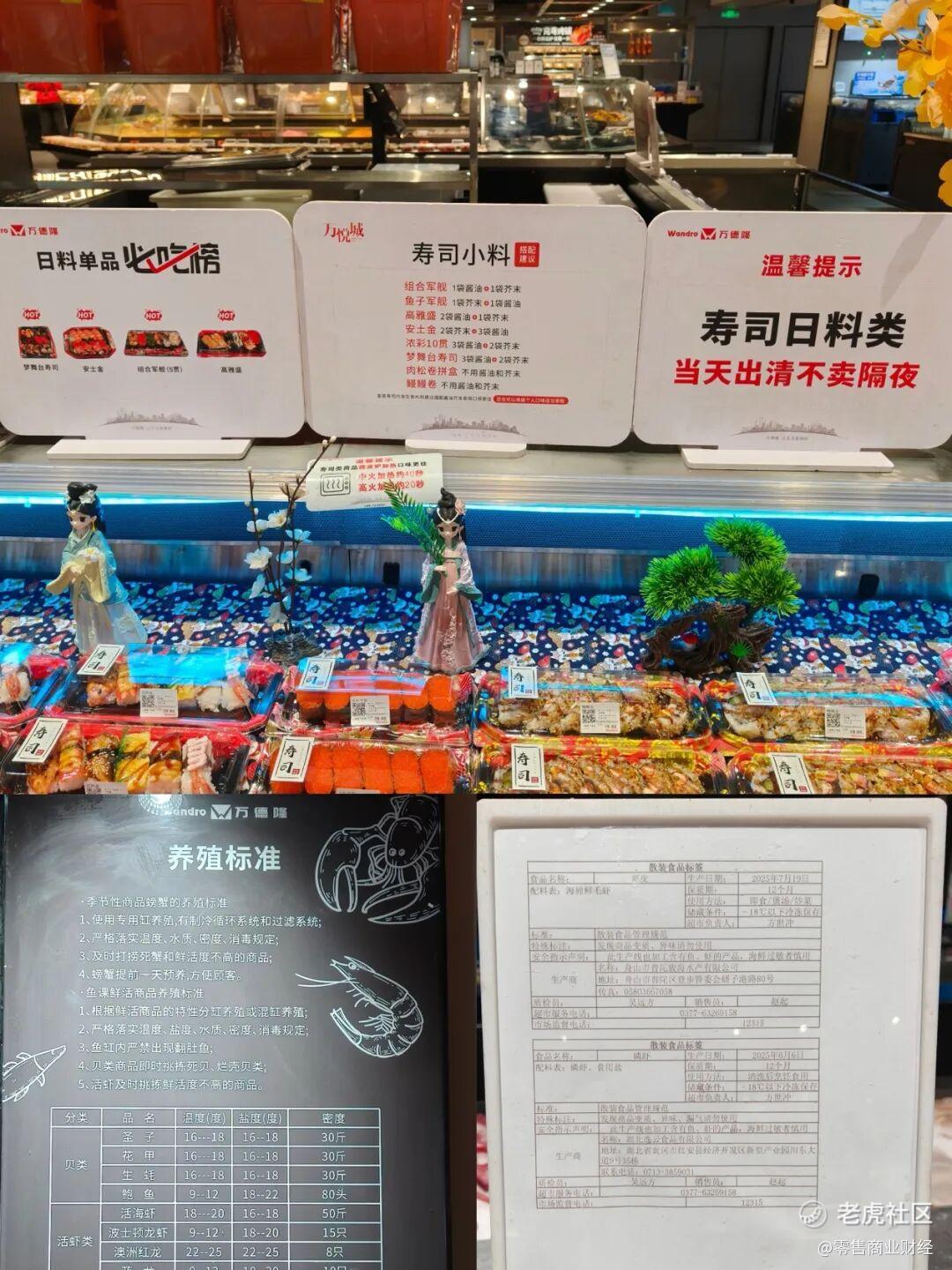 万德隆也是如此,通过“可视化新鲜”与“标准化承诺”强化消费信任:寿司、面点、烤鸡等区域明确标注“新鲜出炉,仅售一天”“本柜商品每天日清”;店内包装熟食均公示配料表、超市服务电话及市场监督电话;水产区详细列明养殖标准,包括不同品类的适宜温度、盐度及密度。