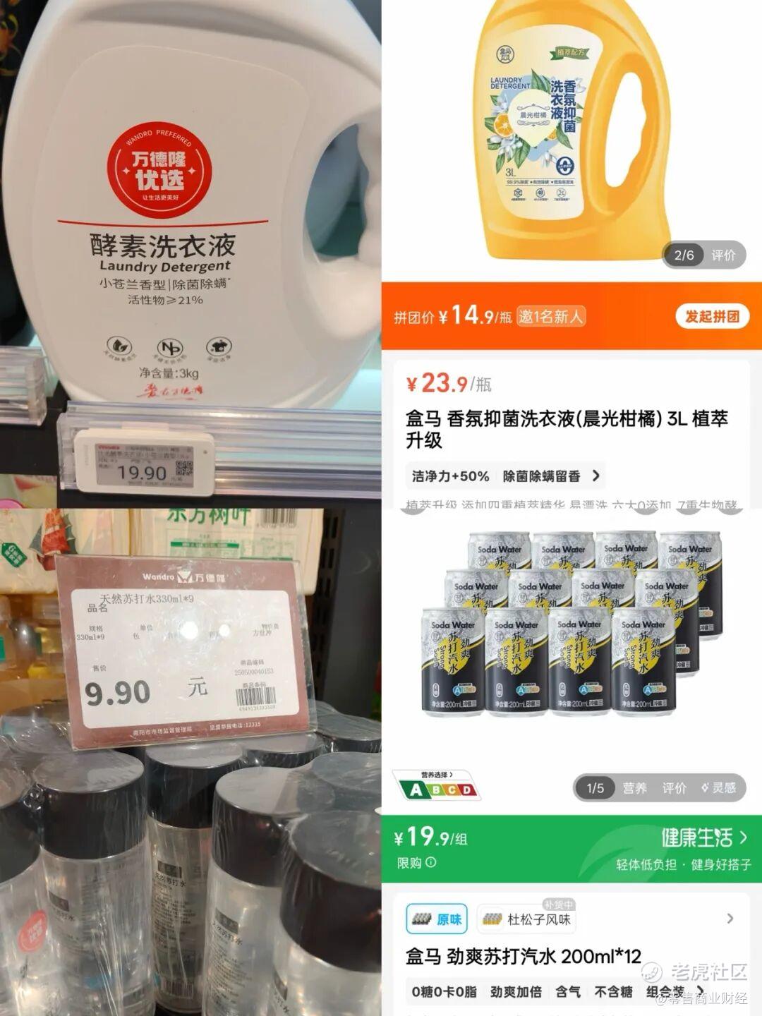 商品侧,万德隆优选酵素洗衣液3kg售价19.9元,对比盒马自营的香氛抑菌洗衣液3L售价23.9元;还有万德隆优选的天然苏打水330ml*9一组售价9.9元(单价1.2元),对比盒马自营的劲爽苏打水330ml*12售价19.9元(单价约1.7元),高性价比成为核心竞争力。
