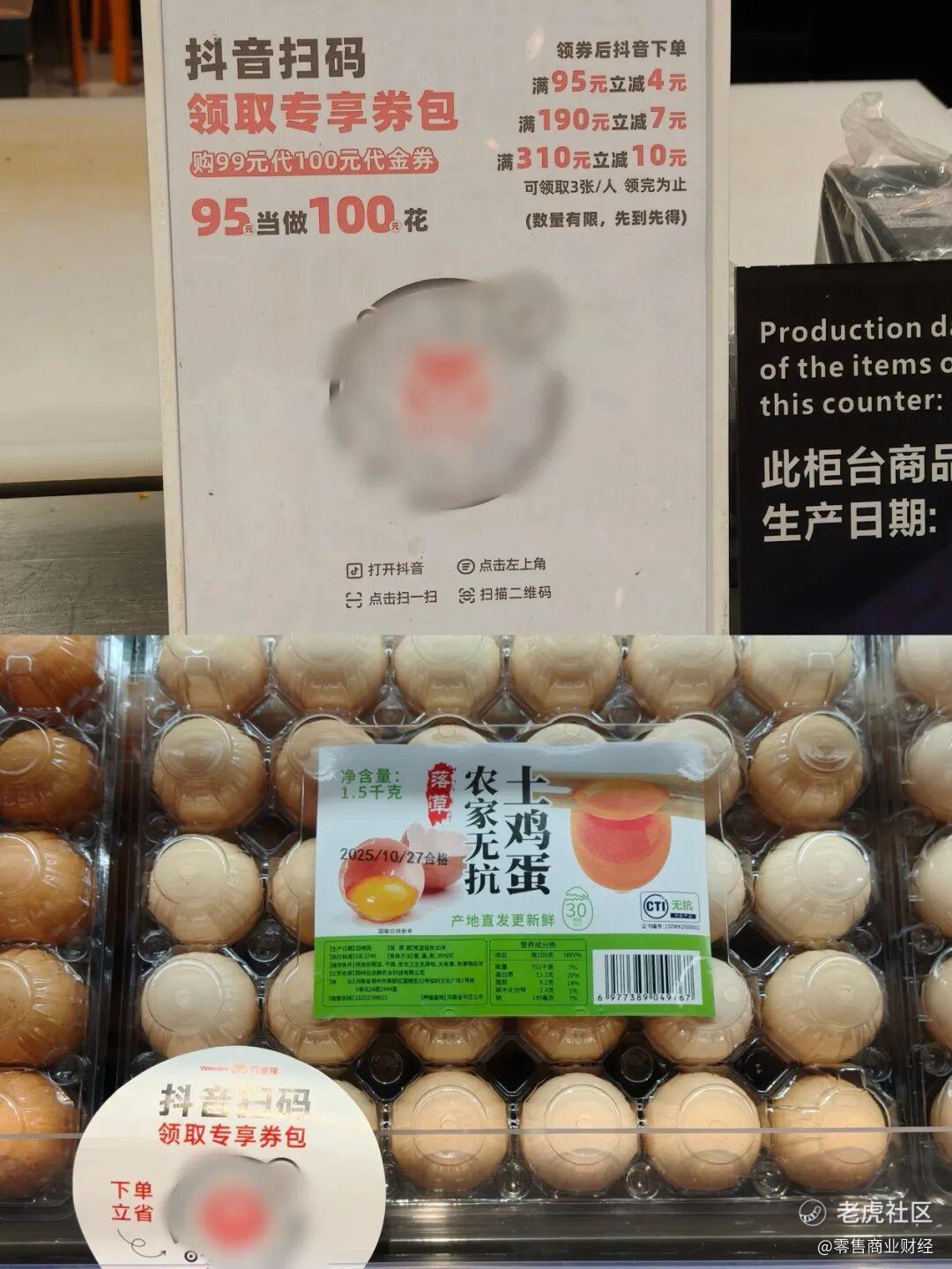 新商超玩家快速突击,并且加速推进线上线下的融合,当然万德隆超市也对市场变化做出迅速反应,店内很多商品货架的标签上都贴着“抖音扫码领取专享券包”的二维码,包括领券下单满减的各类活动。