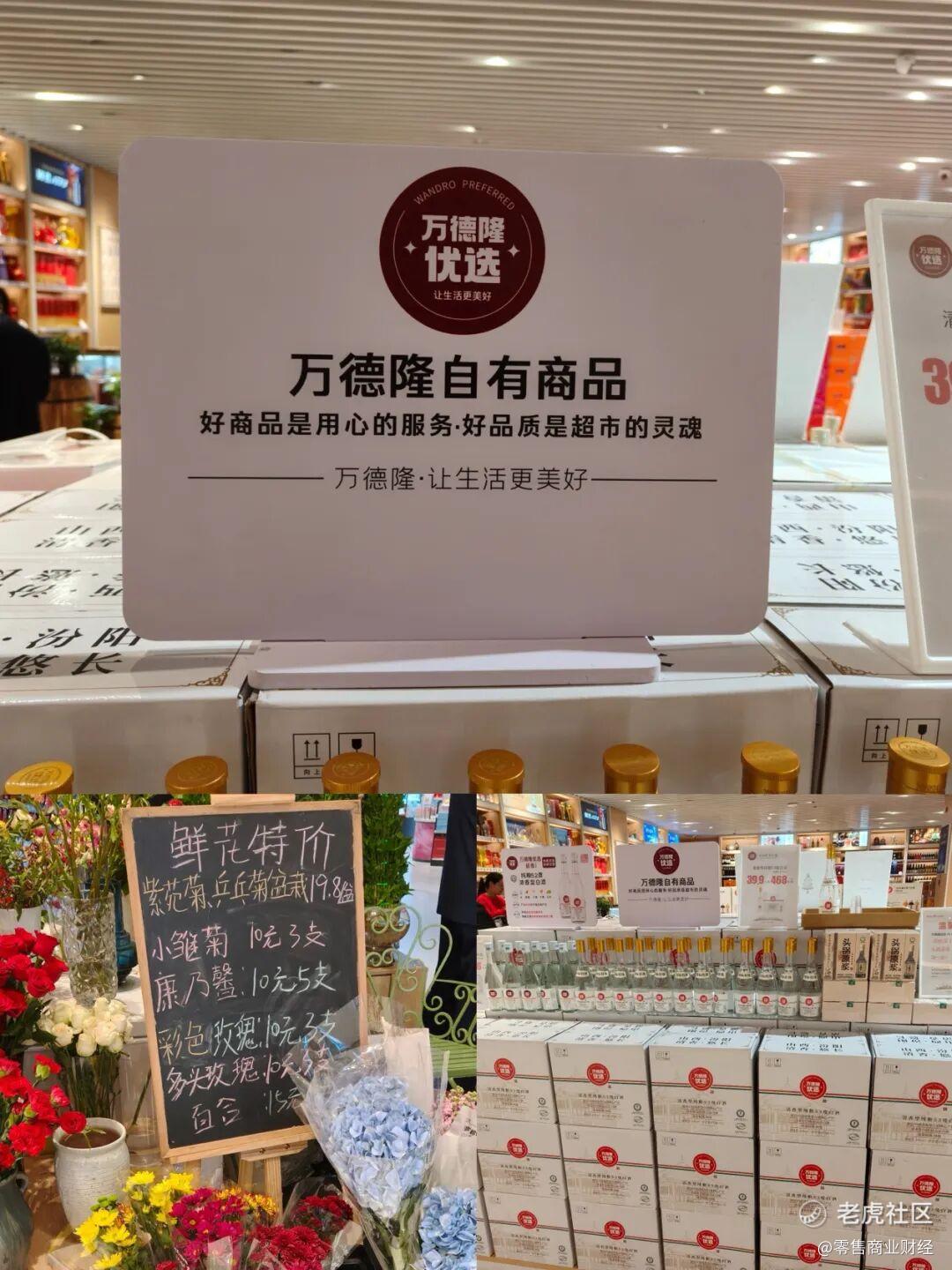 比如超市入口处增设鲜花专卖区,小雏菊3支10元、康乃馨5支10元、彩色玫瑰3支10元等,高性价比花卉成为消费新场景。入口旁的烟酒礼品区,在靠近人流动线密集区的堆头摆放着白酒、精酿啤酒等万德隆自营商品,其招牌还写明了万德隆自有品牌的理念:好商品是用心的服务,好品质是超市的灵魂。