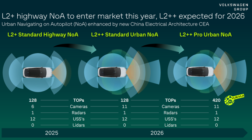 而自研SoC将打通算法、软件与硬件三层体系,使大众拥有更完整的全栈研发能力,整合模式不仅能缩短系统验证周期、降低供应成本,也为后续功能迭代提供更高自由度。