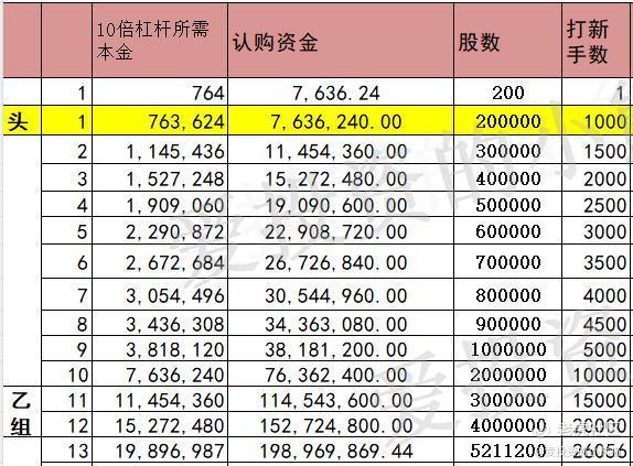 乙头需要认购资金764,乙组的各档融资所需要的本金还有融资金额对应如下表: