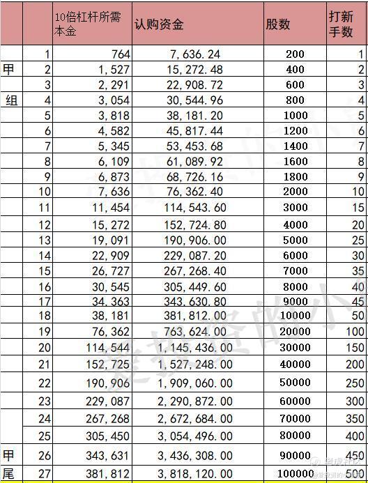 甲组的各档融资所需要的本金还有融资金额对应如下表: