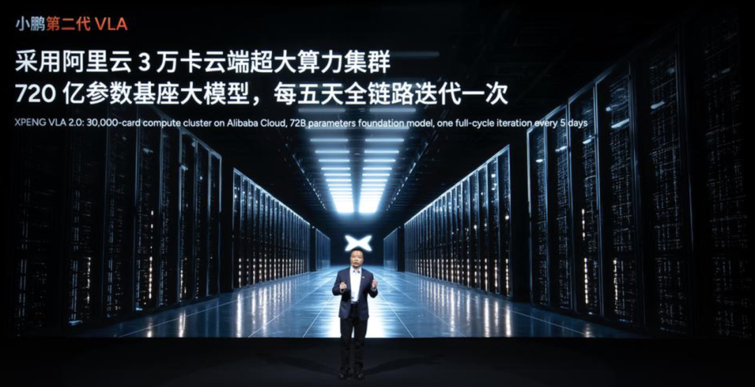 小鹏在云端构建的全球领先智算集群——总规模超过3万张计算卡,部署720亿参数的基座大模型,云端至车端的全链路可在五天内完成一次迭代,模型能以极高的频率自我优化,在端侧保持快速适应性与实时进化能力。