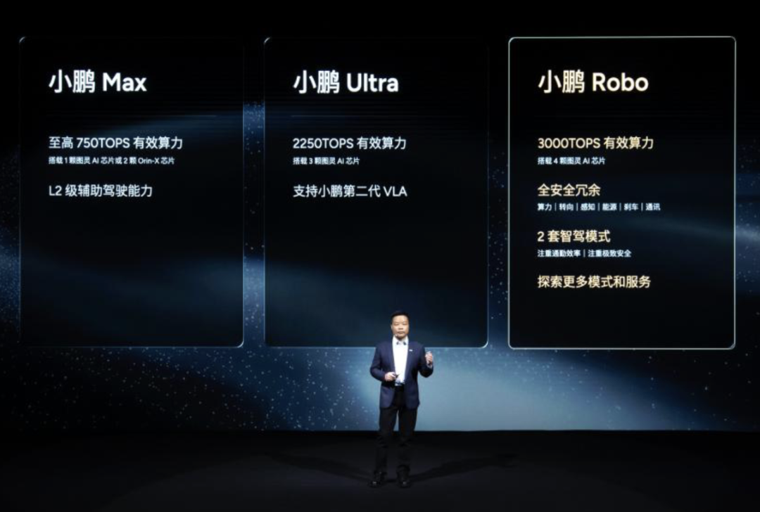 小鹏计划在2026年启动城市级示范运营,并同步推出三款Robotaxi车型。其最高配版本小鹏Robo,将搭载四颗图灵AI芯片,总算力达到3000 TOPS,具备L4级自动驾驶能力。