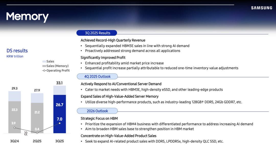 三星在HBM3E的量产上已取得进展,并计划2026年量产HBM4,提升在AI芯片供应链中的地位,存储业务的利润率显著改善,本季度营业利润达到7万亿韩元,占集团整体利润的过半。