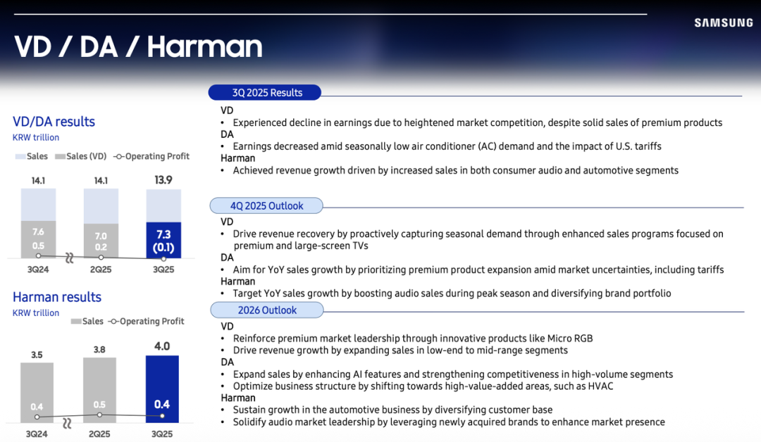 ◎ 三星的VD/DA业务仍处于亏损状态。本季度营收13.9万亿韩元,同比下降1%,营业亏损0.1万亿韩元。