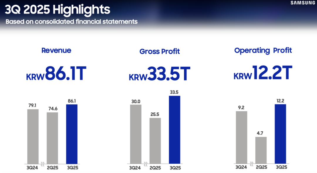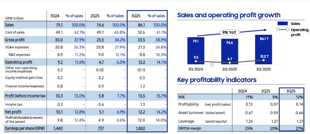 2025年第三季度,三星电子的财务表现显著超出市场预期。营收86.1万亿韩元,环比增长15%,毛利润33.5万亿韩元,同比增长11.7%,毛利率提升至38.9%。
