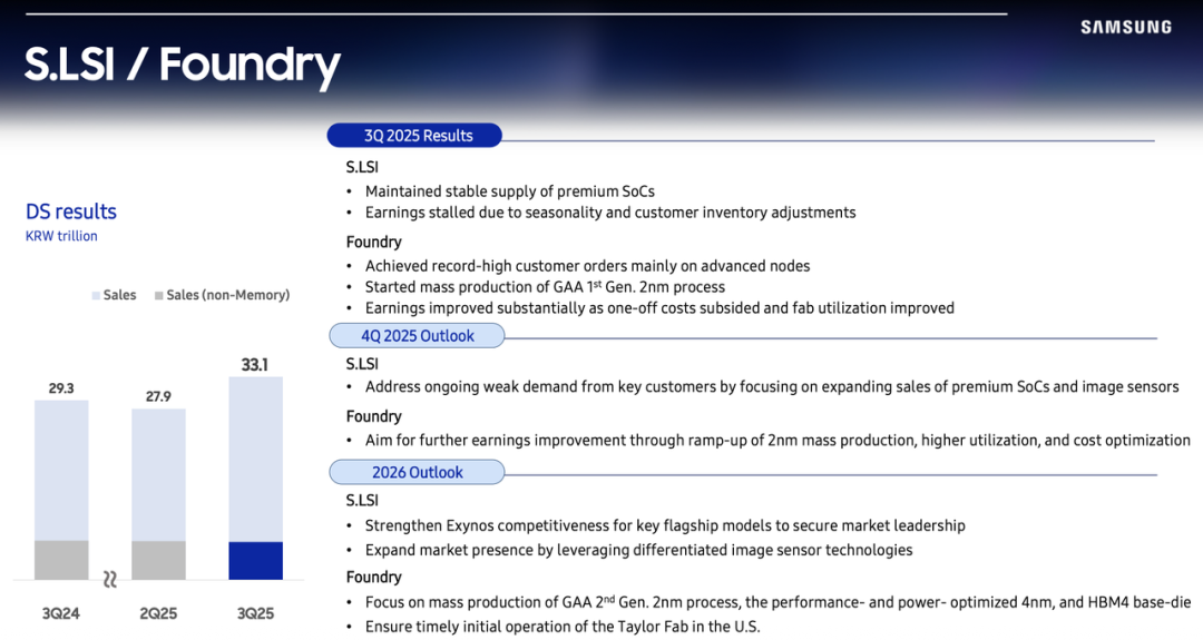 ◎ 同时,影像传感器业务凭借差异化技术实现稳定增长。在Foundry领域,三星正在推动2纳米GAA工艺的量产准备,计划于2026年在美国泰勒工厂正式投产。