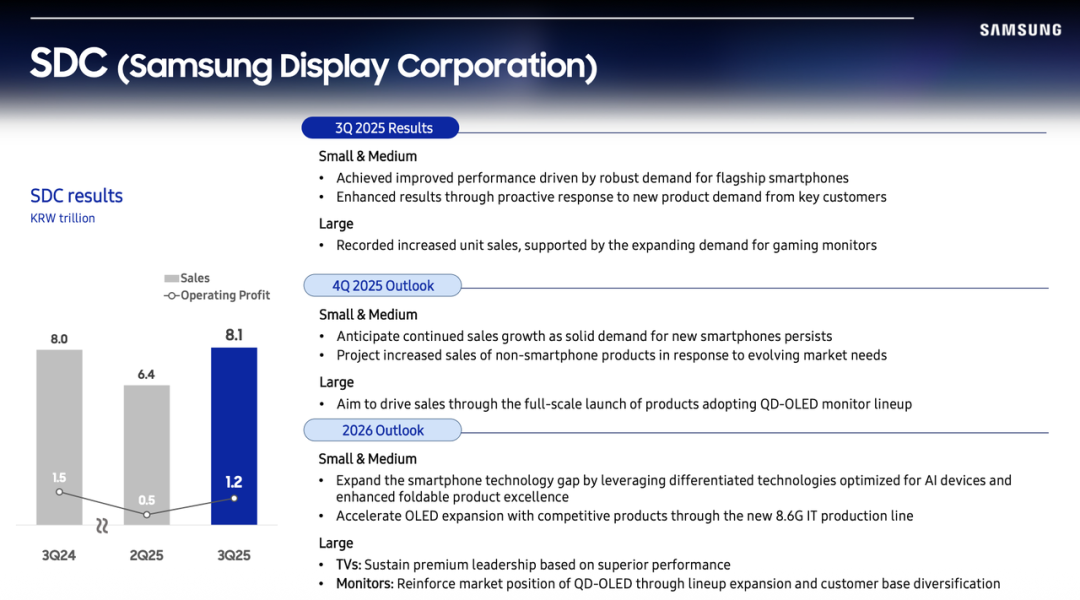 ◎ 三星显示(SDC)业务则迎来小幅回暖,营收8.1万亿韩元,环比增长27%,毛利率修复明显。