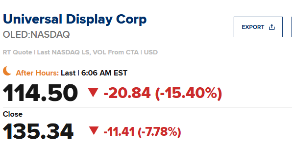 Universal Display (OLED)第三季度每股收益为0.92美元,比市场预期值1.21美元低0.29美元;营收同比下降13.6%至1.3961亿美元,市场预期值1.6415亿美元。该公司预计25财年的营业收入接近6.5 - 7亿美元指引区间的低端,市场预期值6.7882亿美元。