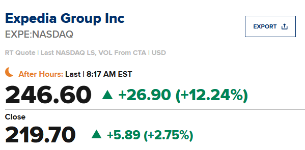 Expedia Group (EXPE)第三季度每股收益为7.57美元,比市场预期值6.97美元高出0.60美元;营收同比增长8.7%至44.1亿美元,市场预期值42.8亿美元。该公司将25财年的营业收入增长率从3-5%提高到6-7%,折合145.1 - 146.5亿美元,市场预期值143.3亿美元。