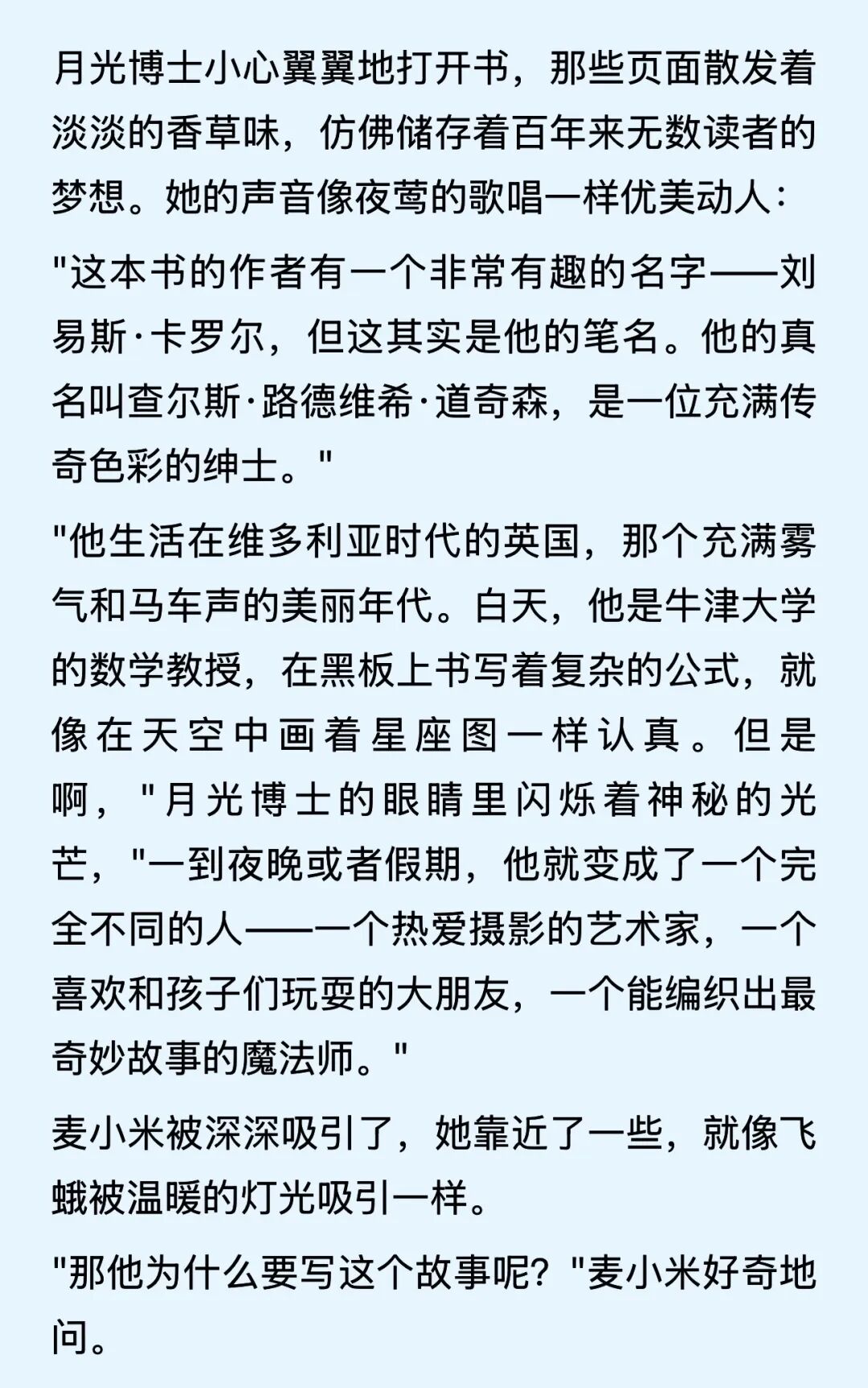 一个叫麦小米(她在凯叔上听的一个故事的主角)的女孩,在放学回家的路上,偶然发现了一条从未见过的小巷,巷子尽头有一座神奇的图书馆。图书馆里有一个慈祥和蔼的老奶奶,她自称“月光博士”。
