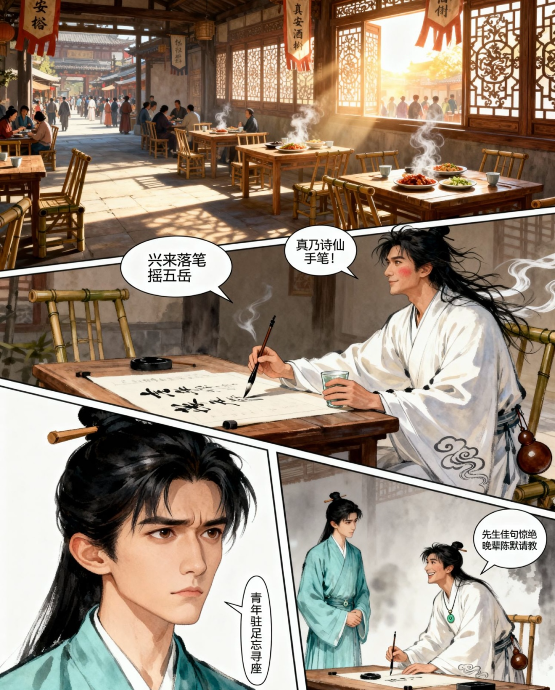 人物形象基本符合描述,场景的氛围感也营造得不错,而且它还有明确的分镜逻辑,故事的起承转合通过画面表达了出来。