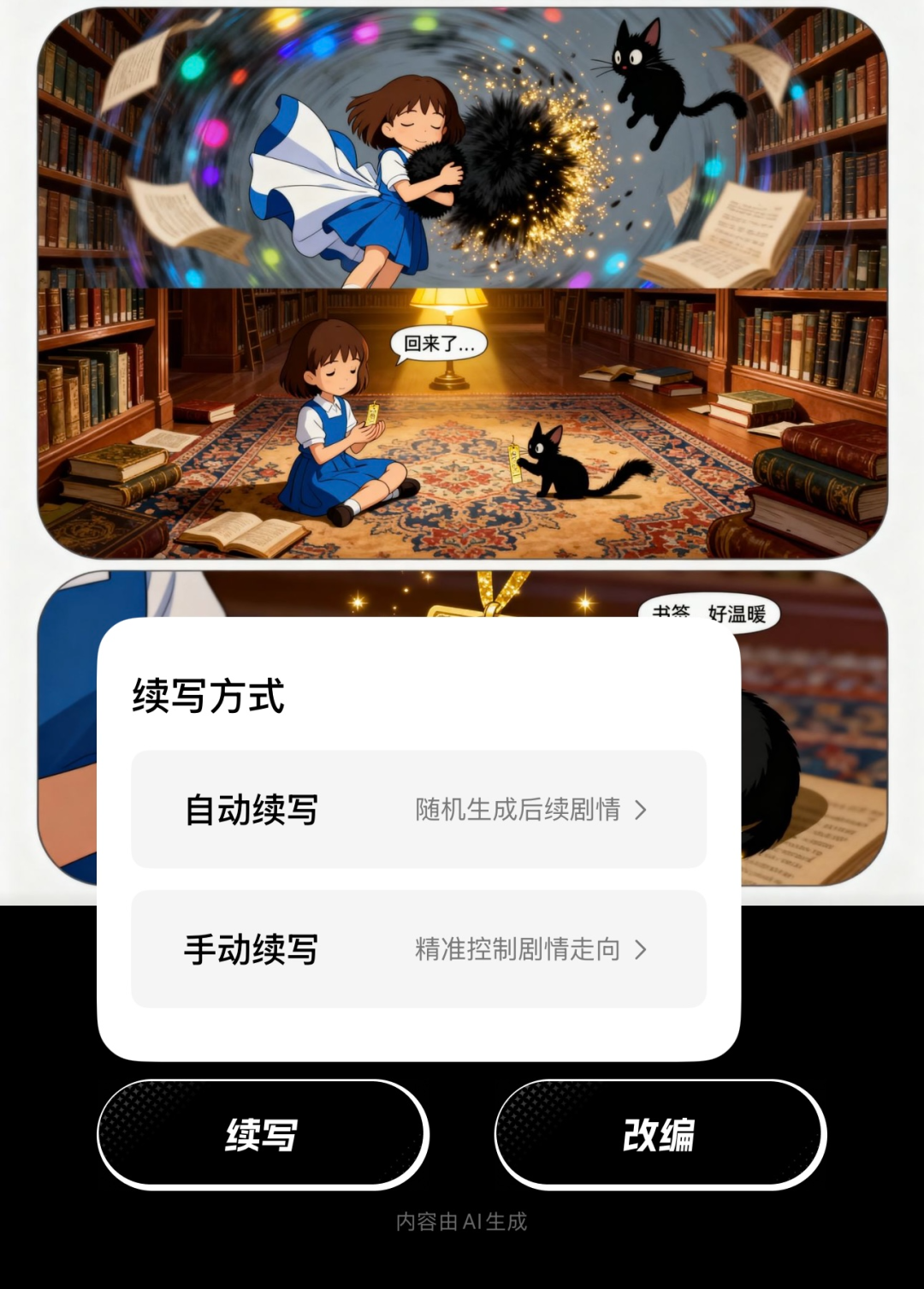 我跟她解释说,“自动续写”就是让AI自己来猜后面的故事,可能会有惊喜,而“手动续写”则可以由她自己来主导剧情的走向。