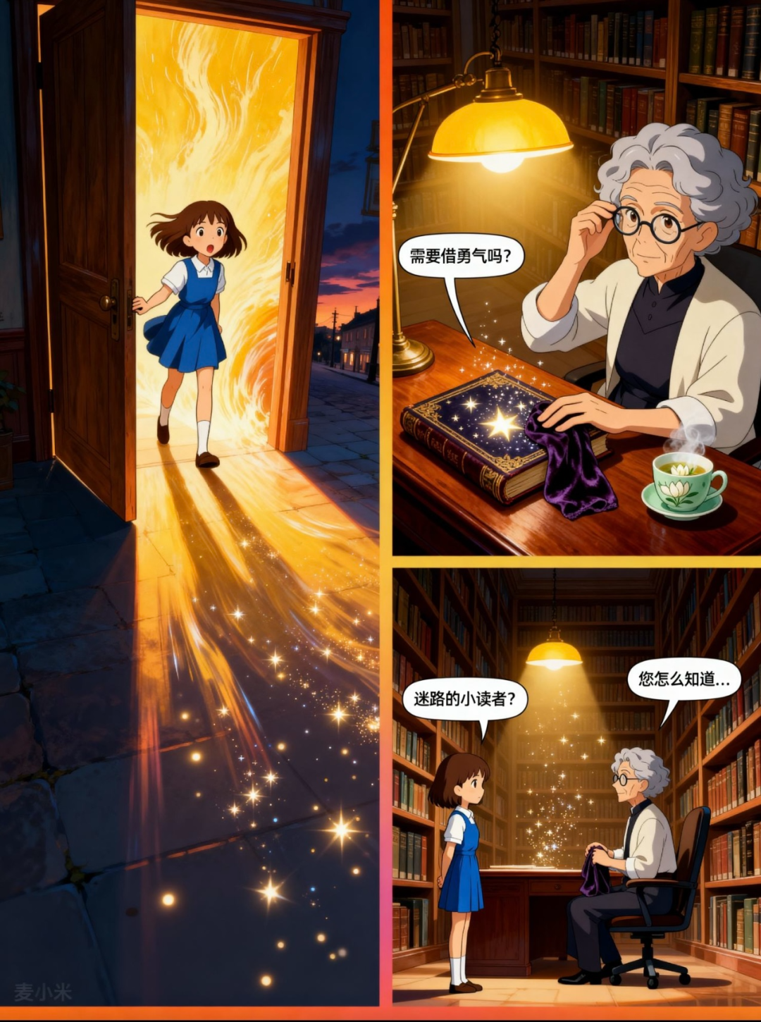 “女生麦小米在放学后发现了一座神奇的图书馆,图书馆里有一位慈祥的奶奶——月光博士,麦小米在生活中遇到问题就会去找她。”