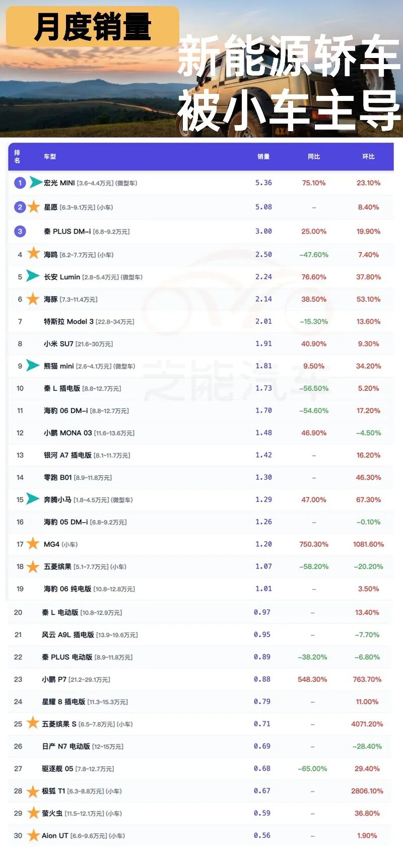 ◎ 宏光MINI以5.36万辆的成绩稳居榜首,同比大增75.1%,环比增长23.1%,产品价格与成熟渠道优势继续保持强劲吸引力。