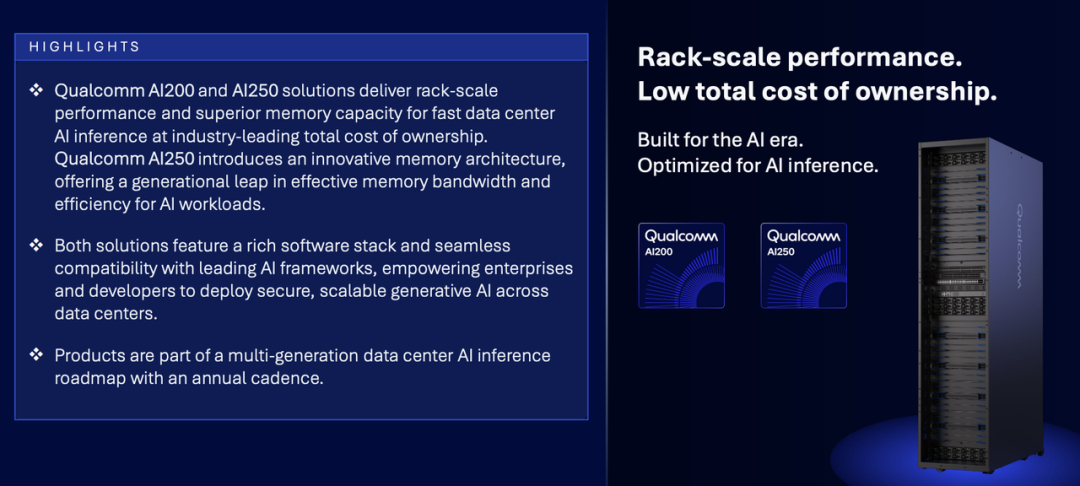 今年10月,高通正式宣布进军AI数据中心市场,发布AI200与AI250两款服务器级AI加速芯片,计划分别于2026年和2027年上市。