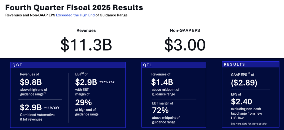 高通交出了一份超出市场预期的2025财年第四季度成绩单:营收112.7亿美元,GAAP口径录得净亏损31.2亿美元。