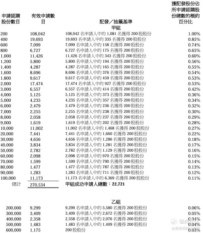配售情况:294053人认购,这次公配1813.77倍,由于执行分配机制B, 回拨比率无,国配有34.33倍,一手中签率1.00%,认购3000手稳中1手,同时乙组23519人申购,其中顶头槌申购368张,获配率0.01%-0.06%。