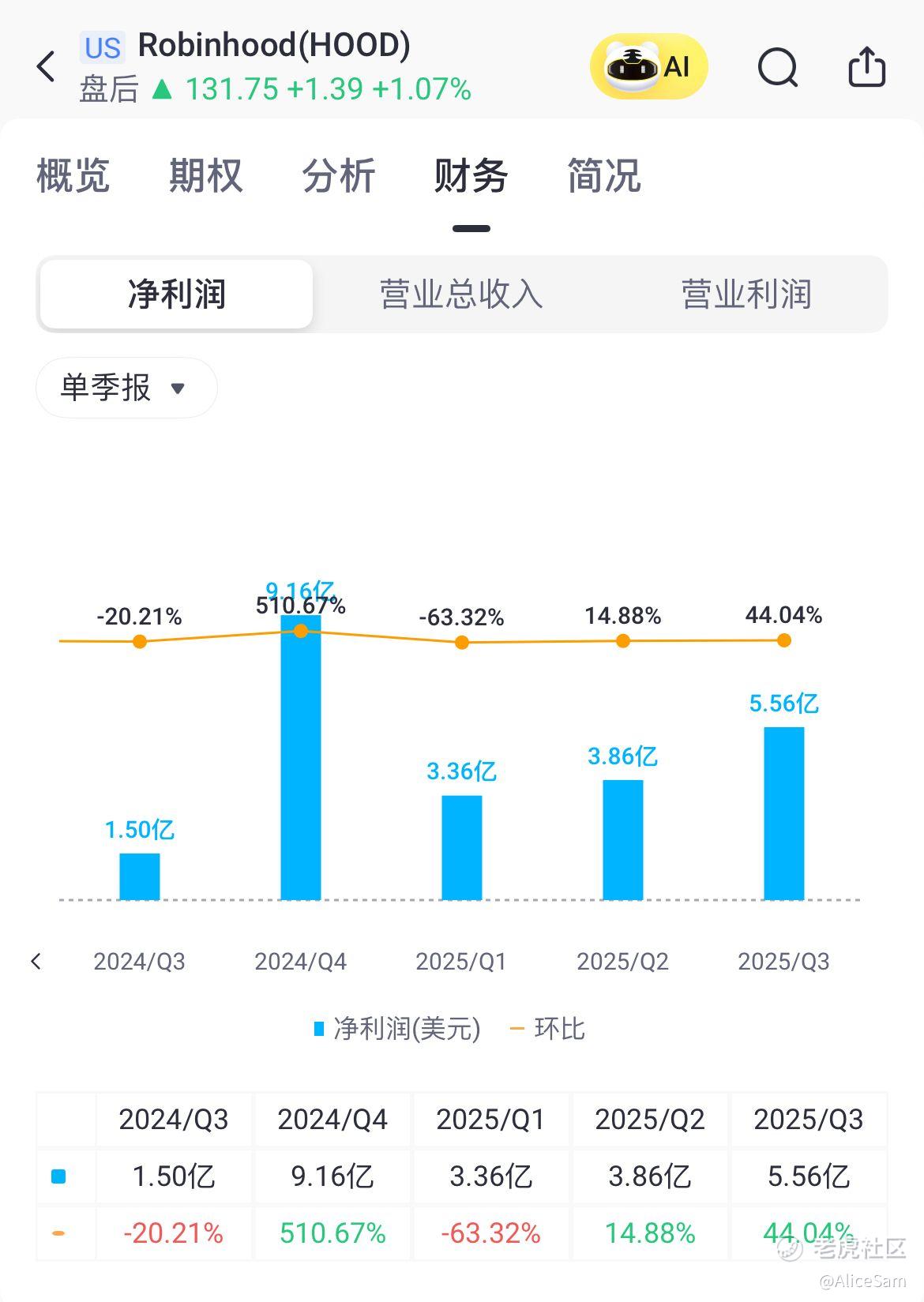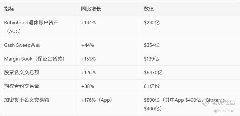 总营收同比增长100%,达到12.74亿美元,创下历史新高,交易类收入同比增长129%,达7.3亿美元,占总营收57%。加密货币交易收入达2.68亿美元,同比增长超300%,成为交易收入增长的最大驱动力。期权交易收入达3.04亿美元,同比增长50%。股票交易收入达8600万美元,同比增长132%。净利息收入同比增长66%,达4.56亿美元,得益于利息资产增长与证券借贷活动增加。其他收入同比增长100%,达8800万美元,主要来自Robinhood Gold订阅用户增长。