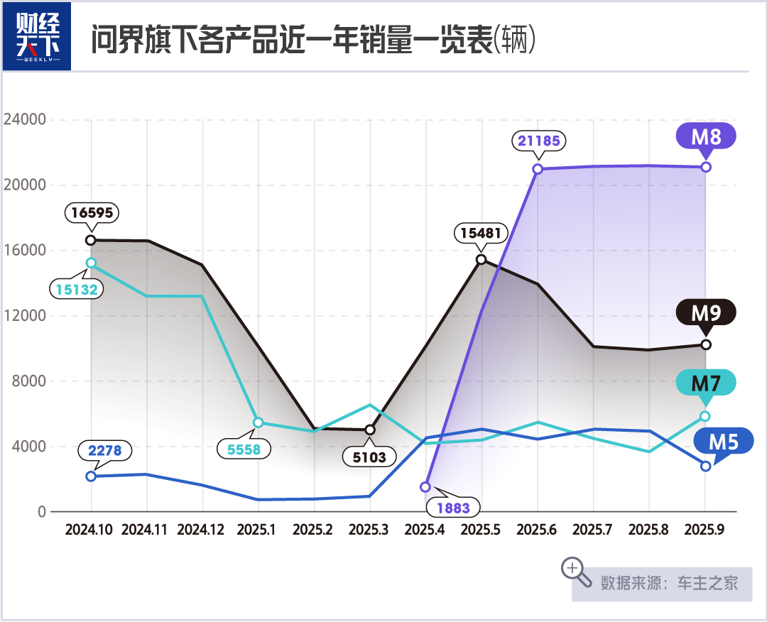 赛力斯的销量担当是问界品牌,目前有4款在售车型:问界M5(指导价22.98万~24.98万元)、M7(指导价24.98万~37.98万元)、M8(指导价35.98万~44.98万元)和M9(指导价46.98万~58.98万元)。