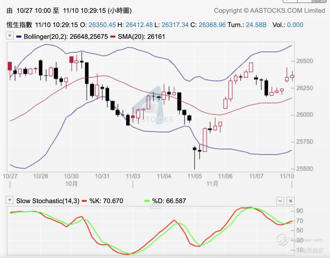 10点打后再睇小时图,见10线守稳兼整条保历加通道有似转向上,所以Slow STC(14.3)两线亦于70前重见%K线高走%D线。