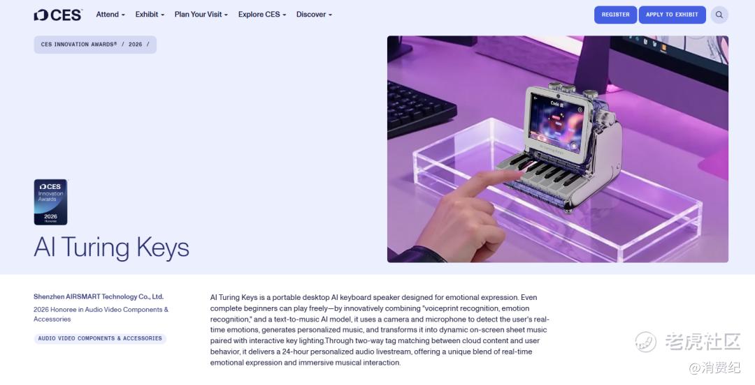 图灵琴Turingkeys,作为2026 CES 音频/视频组件和配件(Audio Video Components & Accessories)类目唯二获奖(2025年11月5日首批公布),AI音乐类软硬件一体获奖产品。
