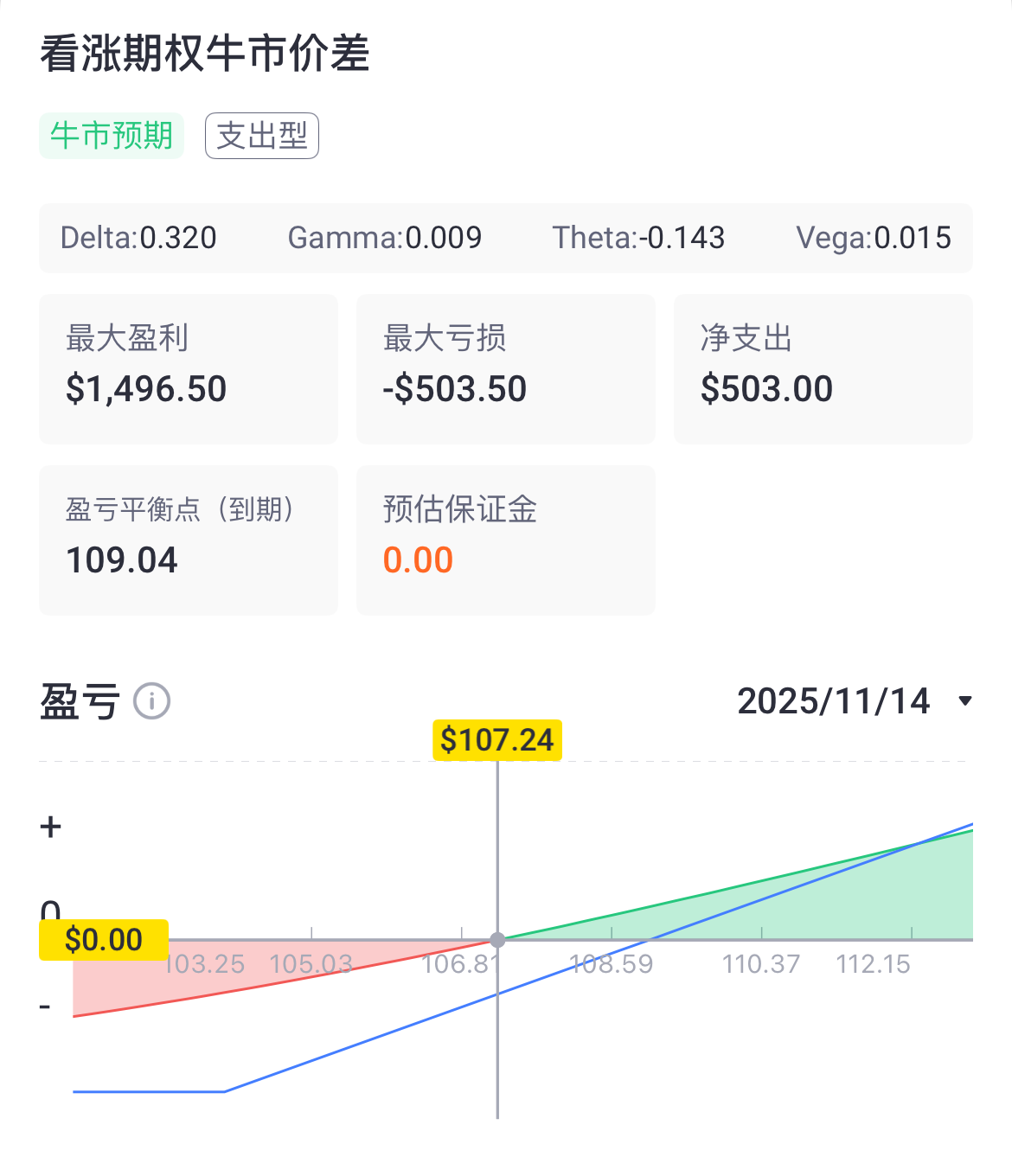 构建方式:买入11月14日到期、行权价104美元看涨期权+卖出行权价124美元看涨期权