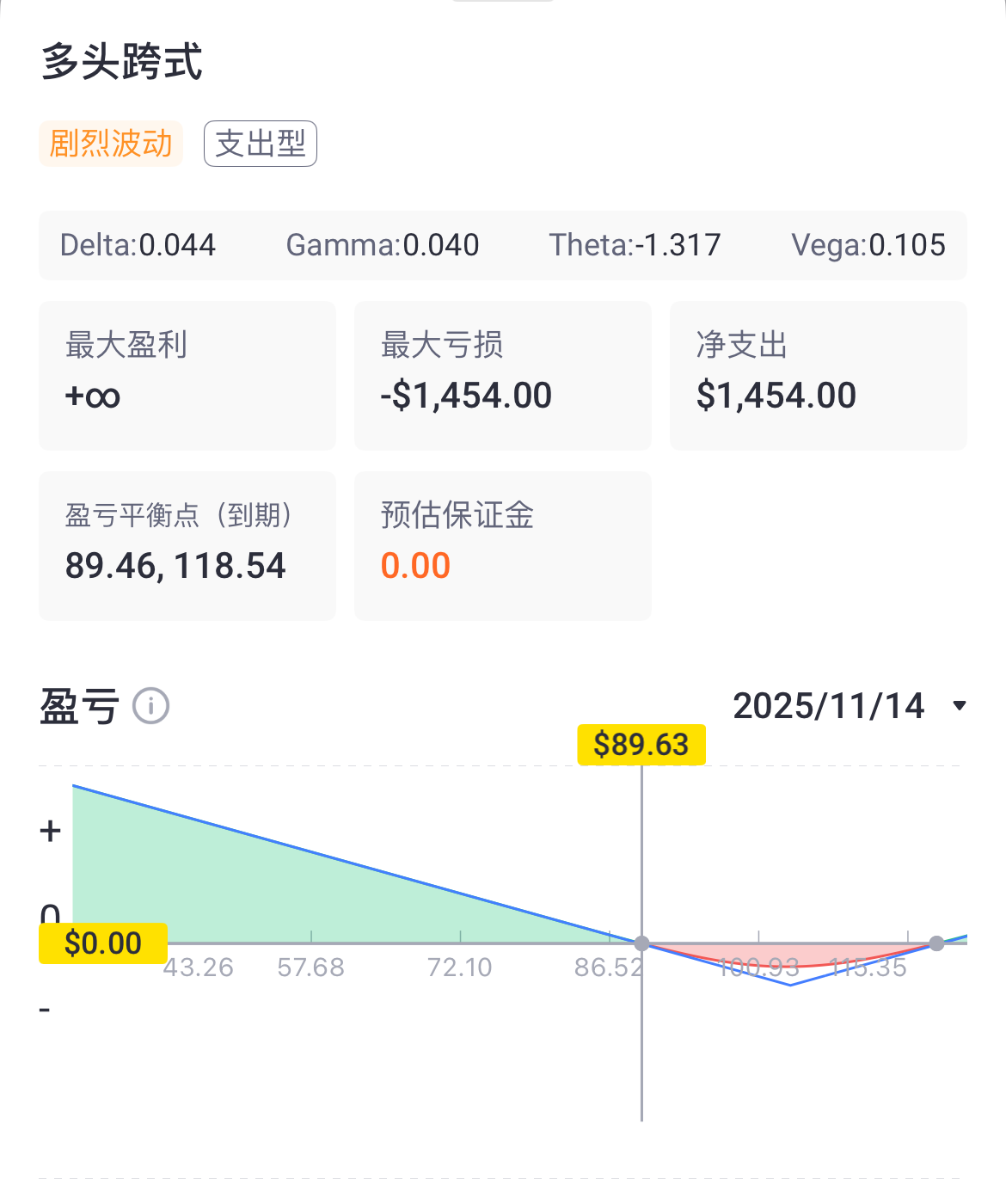 构建方式:同时买入行权价为104美元、到期日为11月14日的看涨期权和看跌期权