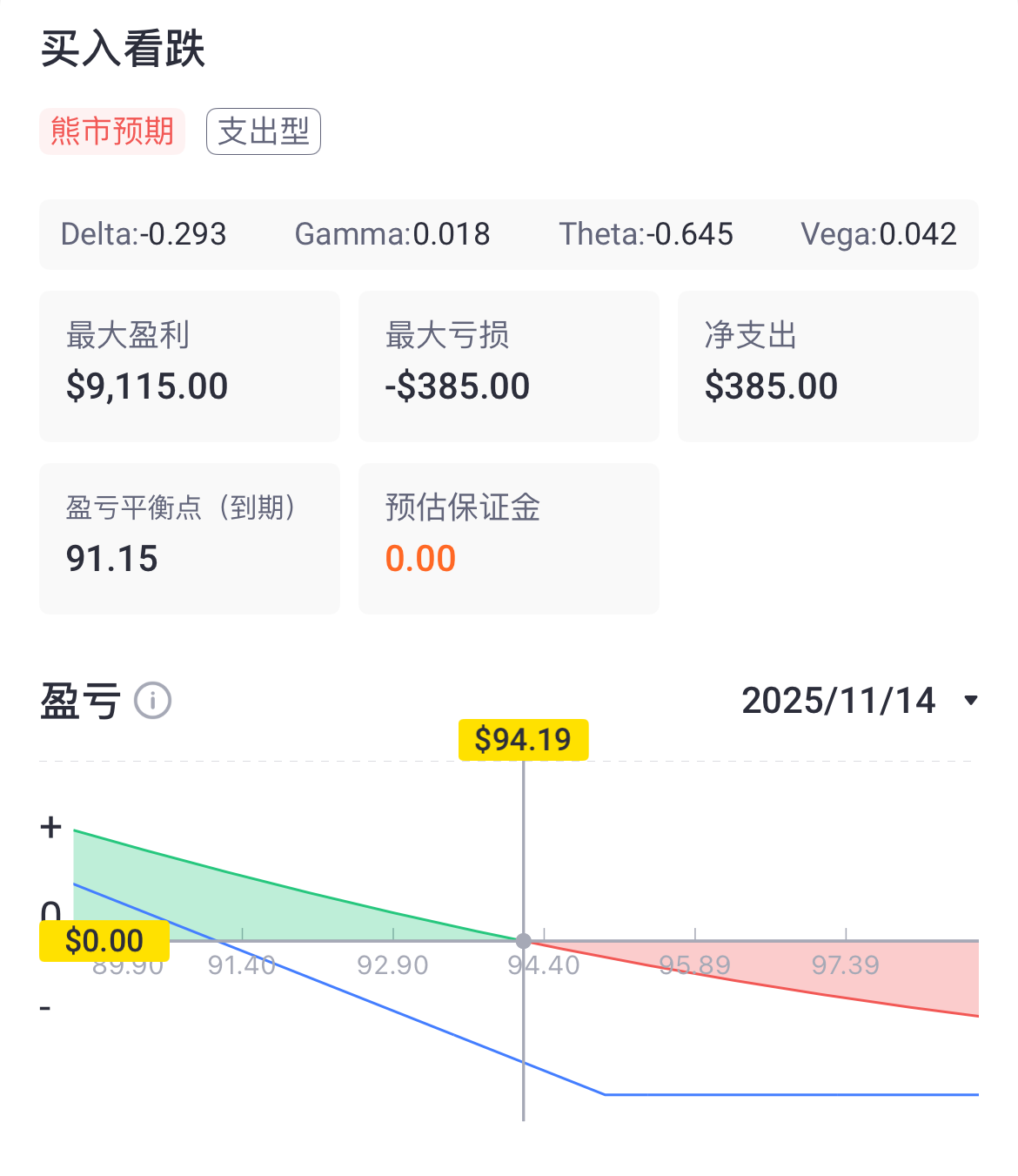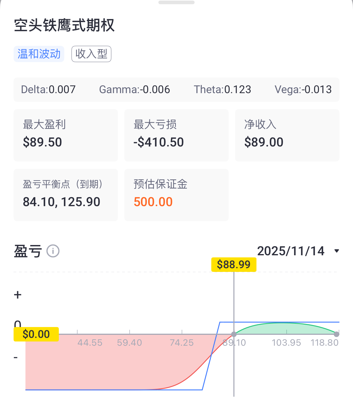 亏损区间:股价跌破80美元或升穿130美元时触及最大亏损410.5美元