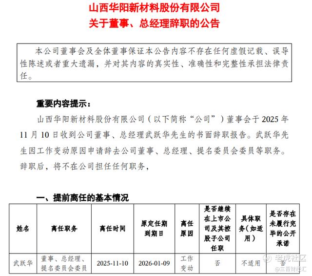 11月10日,山西A股上市公司华阳新材(600281.SH)发布公告称,公司收到董事、总经理武跃华的书面辞职报告。