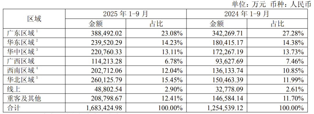 资料显示,东鹏饮料从广东东莞起家,在刚开始体量还不大时,其大部分的营收主要来自广东地区。不过,近年来东鹏饮料开始加速全国化,从网点来看,东鹏饮料的终端网点数量从2020年的约120万家,激增至2025年上半年的超420万家。这意味着在四年多的时间里,平均每天有近2000个新网点开始销售东鹏的产品;而从经销商数量来看,截至2025年第三季度东鹏饮料的经销商数量增至3271家,较去年同期增长9.3%。