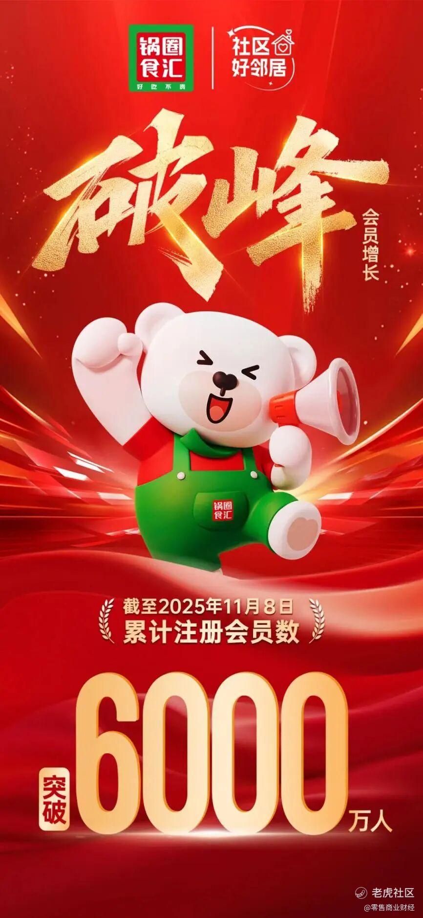 11月9日,锅圈食品官微宣布,截至2025年11月8日,公司累计注册会员数突破6000万人,提前50天完成年度目标。锅圈创始人、董事长杨明超曾明确表示,会员已成为“存量市场中巨大的增量来源”,公司将持续通过精细化运营,“把会员变成粉丝,把粉丝变成铁粉”,同时推动体系从“个人会员”向“家庭会员”深化。自2024年起,锅圈正式启动“会员工程”,通过分级运营、权益优化与数字化服务,持续提升会员黏性与消费频次。数据显示,截至2025年6月30日,锅圈会员数已达5030万人,同比增长62%;会员预付卡金额5.9亿元,同比增长27%。在随后不到5个月内,会员规模再增近1000万人,增长势头稳健。