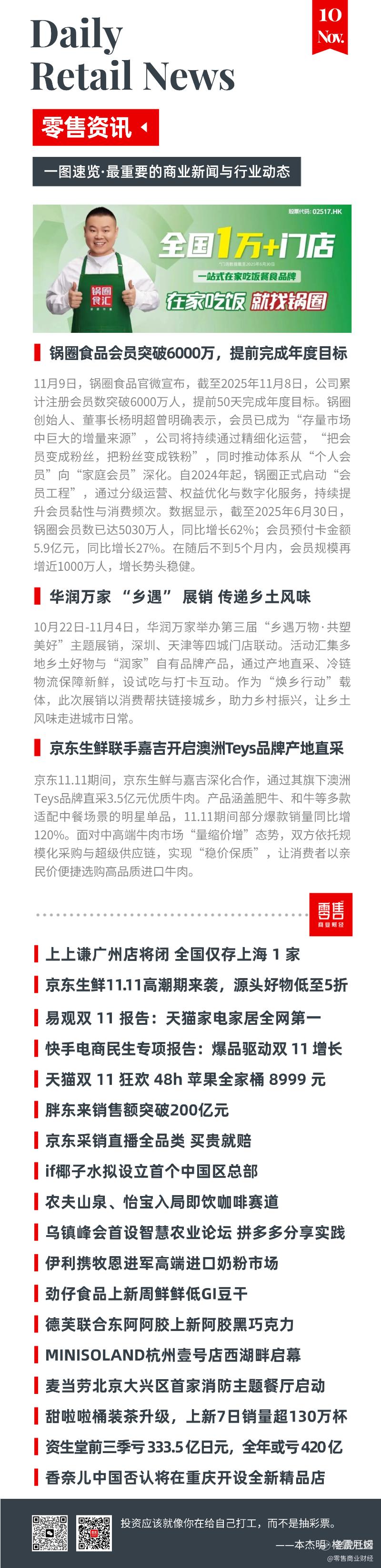 锅圈会员突破6000万;胖东来销售额突破200亿元