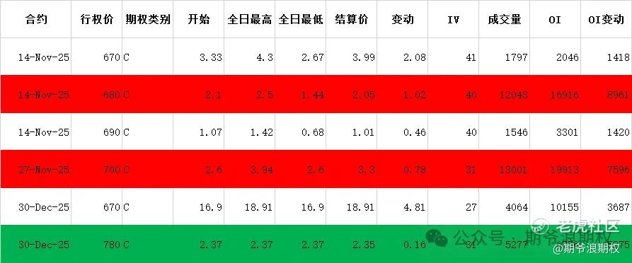 (1)腾讯:11月最大持仓范围660-700,窝轮牛熊街货分布595-705,今收649.5,上涨2.44%。期权盘路变化超过1000张的仓位如下,红色是增仓较大的,绿色是减仓较大。绿色的12月780购,是10月20号增加的仓位,都是5000多张,价格在4块左右,不管主动方是买还是卖,反正都不太相信12月能到780的赶脚。红色的仓位一个是11月14日的680购大增8900张,另一个是11月的700购大增7500张,这两个仓位背后的大户认为,短期内可能会到680,甚至700。