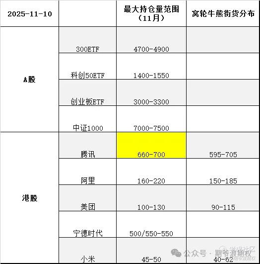 下图是今天大A的3个ETF和中证1000,以及港股的腾讯、阿里、美团、宁德和小米的最大持仓量范围以及窝轮牛熊分布范围,也就是11月的期权筹码分布,黄色的表示跟上个交易日有变动。