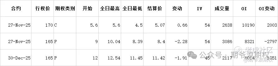 (2)阿里:11月最大持仓范围145-220,窝轮牛熊街货分布150-185,今收163.4,上涨2.06%。期权盘路变化超过1000张的仓位如下,今天阿里的的期权市场较冷清,大佬们貌似都在观望。