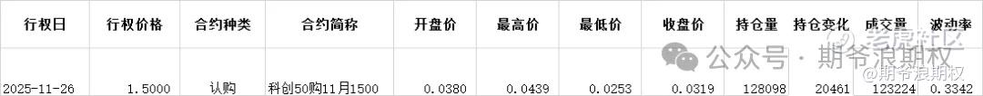 (2)科创50ETF:11月最大持仓范围1450-1550,今收1.478,下跌0.61%。期权11月主力合约,认购和认沽都是低行权价增仓高行权价减仓。认购增仓集中在1400-1600,合计3.8W张,1650及以上都是减仓,但合计不到1W张;认沽1250-1450增仓,1500及以上都是减仓,增减的量都不大。市场总体偏悲观,变化超过1W张的仓位如下: