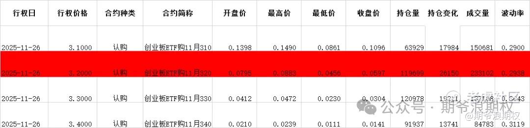 (3)创业板ETF期权:11月最大持仓范围3000-3300,今收3.158,下跌0.85%。期权11月主力合约,认购和认沽都是增仓为主。认购增仓集中在3000-3700,合计8.9W张;认沽增仓集中2700-2950,合计2.7W张。市场多方在发力,但是也有很多资金比较担心。变化超过1W张的仓位如下,红色是增仓较大的。